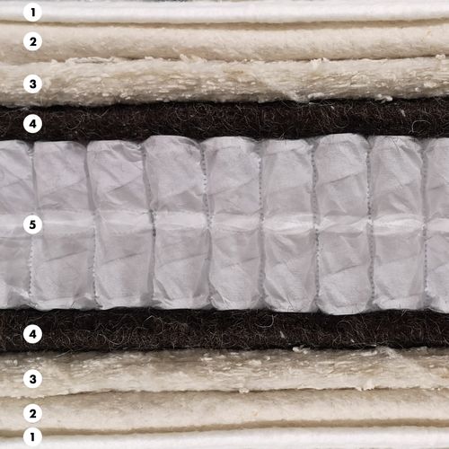 3) Cotton & wool: Bonded layers of cotton and wool, a cost effective natural comfort layer that provide optimum comfort, temperature regulation, fire protection and resilience. This deep layer of fibres is very responsive and plays an important role in the support of the mattress.