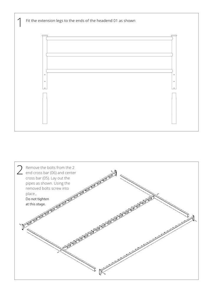 - Step 2 Remove the bolts from the 2 side rails, 2 end cross bars and centre cross bar. Lay out the pipes as shown. Using the removed bolts, screw the base of the metal bed frame into place. Do not tighten the screws at this stage.