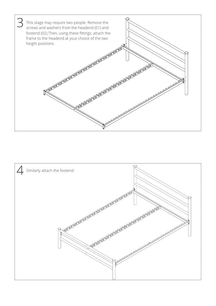 - Step 3 Remove the screws and washers from the headend and footend. Then, using thse fittings, attach the frame to the headend at your choice of height setting. Some beds have 2 height settings but some only have 1.