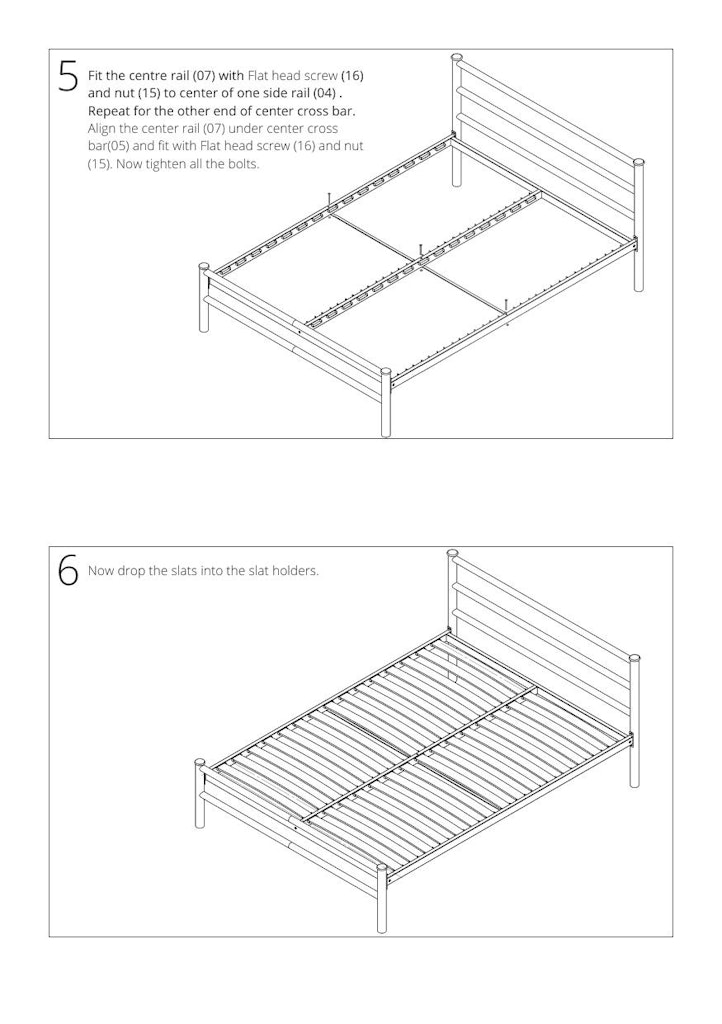 - Step 5 Fit the centre rail with flat head screw and nut to the centre of one side rail. Repeat for the the other end of the centre cross bar. Align the centre rail under centre cross bar and fit with flat head screw and nut. Now tighten all the bolts.