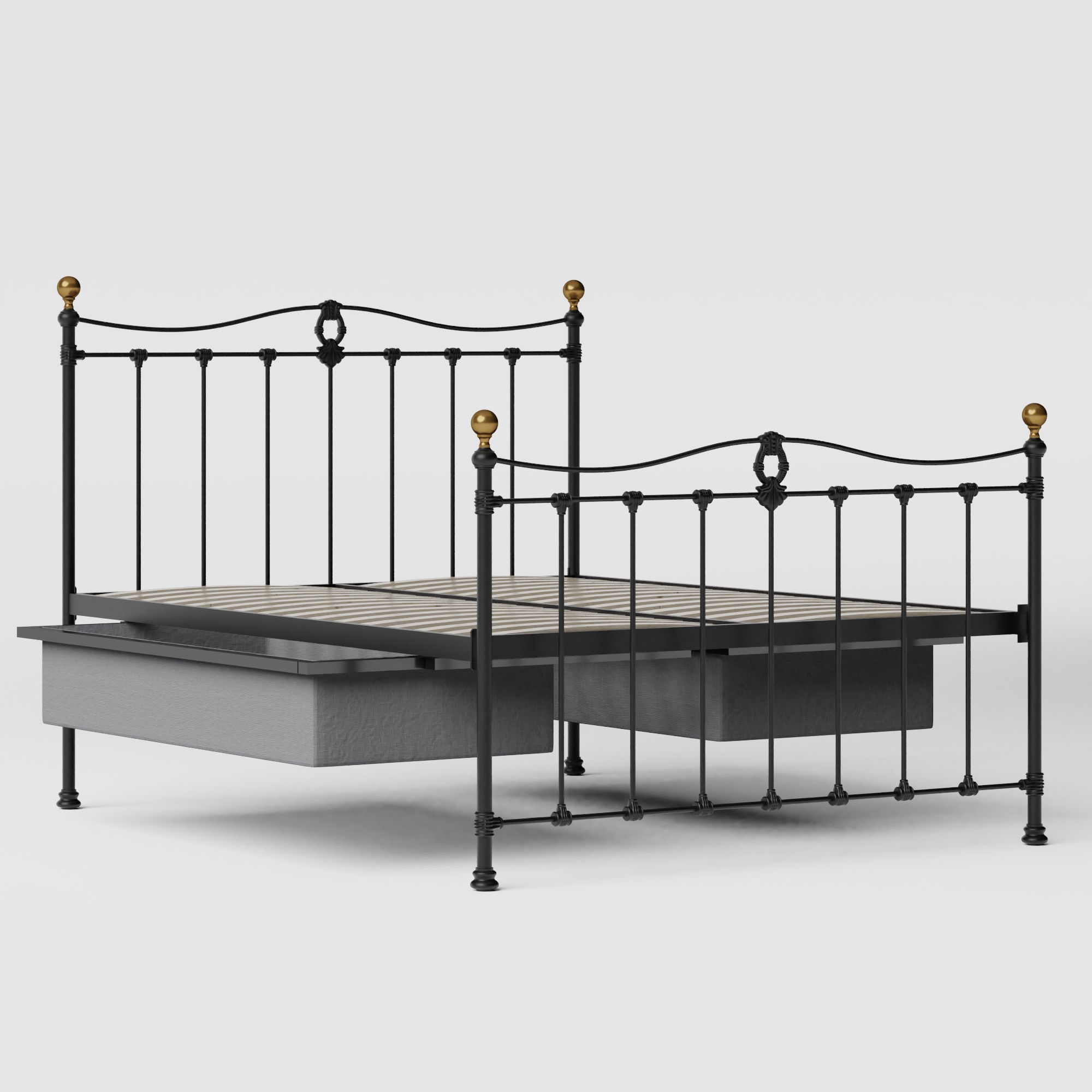 The storage for our iron beds have a black frame and a grey cloth bag. They sits under the frame of the bed and slide in and out on bearings. Each drawer has a dimension of 120cm x 54cm x 16cm and is capable of carrying upto 30kgs.